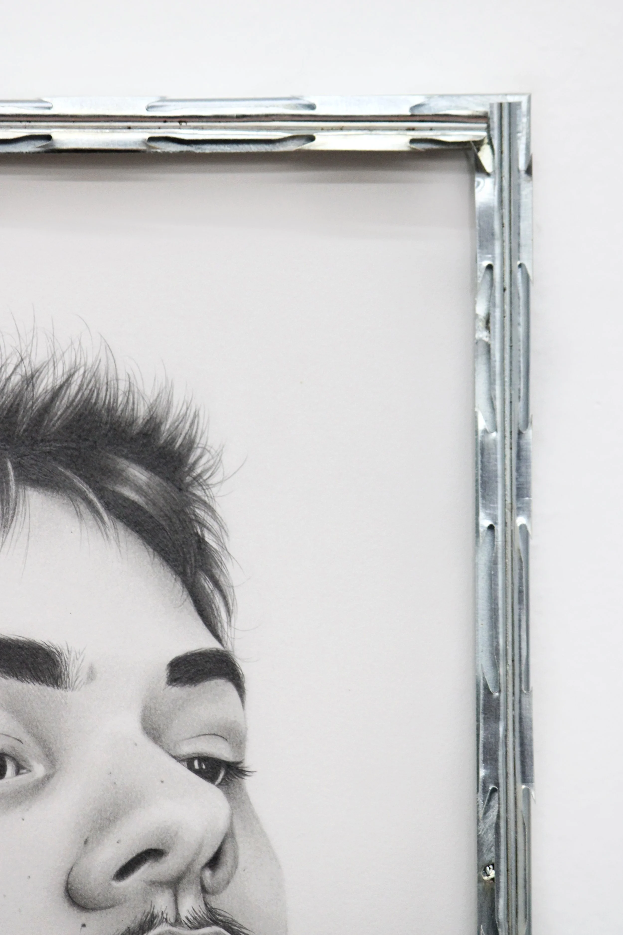 9 desenhos feitos com grafite e caneta em gel sobre papel emoldurados com rede galvanizada de aço